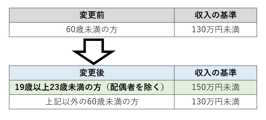 扶養認定日が令和7年10月1日以降で、扶養認定を受ける方が19歳以上23歳未満の場合(被保険者の配偶者を除く)、現行の「年間収入130万円未満」が「年間収入150万円未満」となりました。